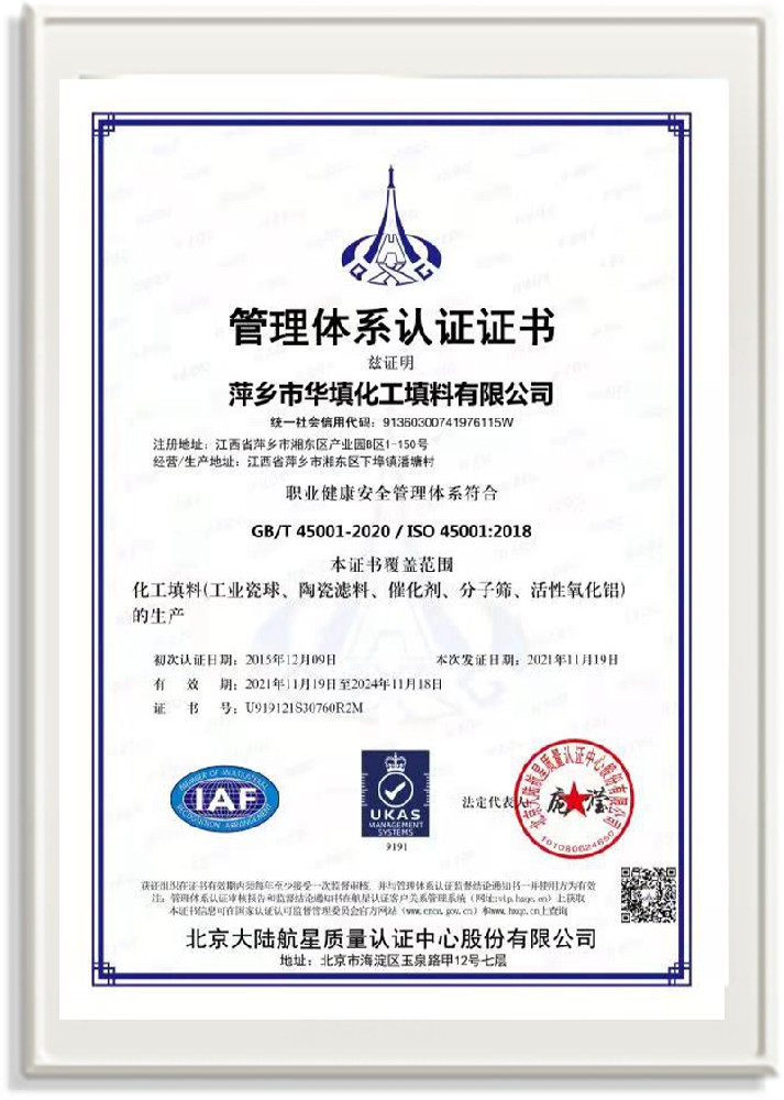 萍鄉市華填化工填料有限公司,位于320國道、109國道、浙贛鐵路、昌金高速公路貫穿其中,交通便利,是江西西部一顆燦爛明珠,創(chuàng)建于20世紀70年代初期,是中國石油天然氣股份有限公司“能源一號網”會員企業、中國石化物資采購電子商務網絡和中國海洋石油總公司采辦業務系統成員單位,是上海大學江西材料基因組工程產業研究院工業陶瓷產業創(chuàng)新聯盟基地,且通過ISO9001:2015質量管理體系、ISO14001:2015環(huán)境管理體系、ISO45001:2018職業健康安全管理體系認證的化工填料生產企業。公司擁有陶瓷、塑料、金屬填料、催化劑、活性氧化鋁、分子篩等產品生產線,現有固定資產3616萬元,占地面積3.8萬平方米。公司具有悠久的生產歷史、雄厚的技術力量和先進的生產工藝設備,可生產工業瓷球(支撐劑)、陶瓷、金屬、塑料質的規(guī)整、散堆化工填料及分子篩、催化劑、生化濾料、活性氧化鋁、石化助劑、活性炭、環(huán)保材料、耐火材料等系列的200多種規(guī)格型號產品。